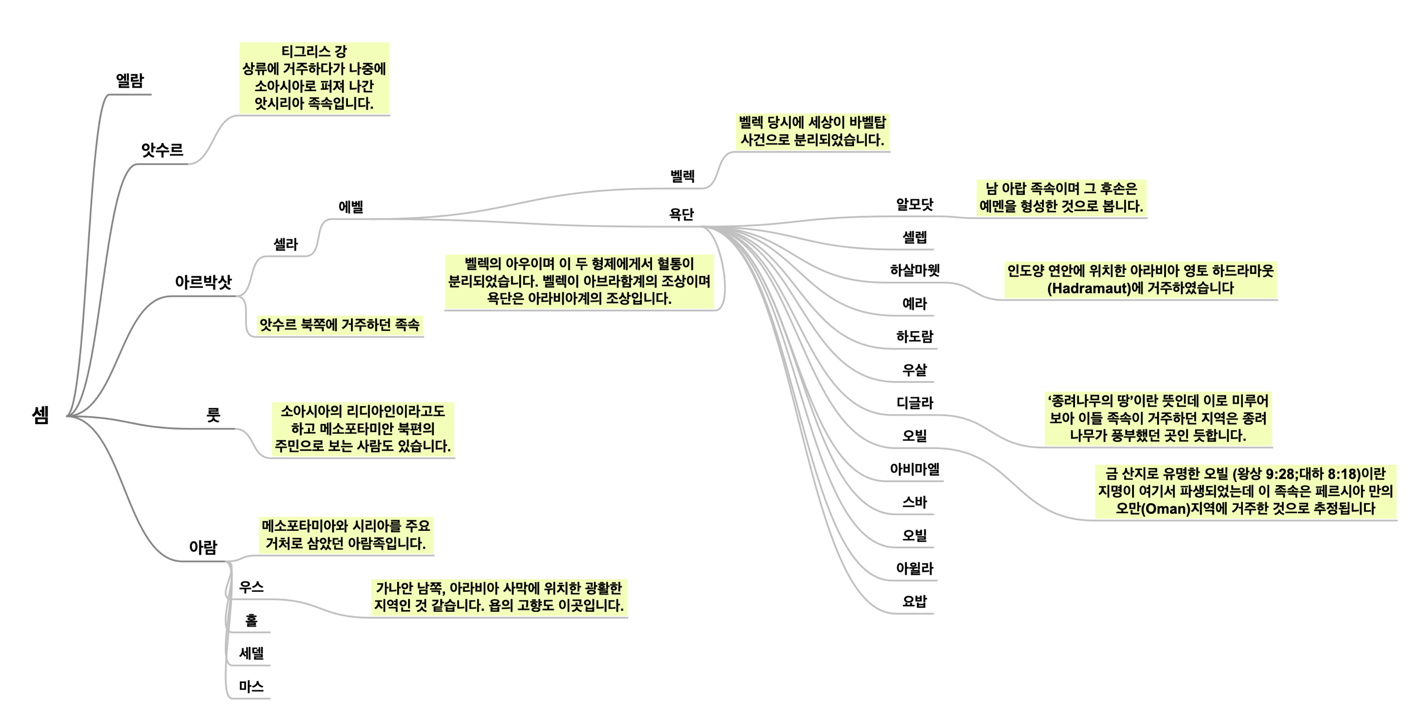 셈은 에벨 온 자손의 조상이고 야벳의 형입니다. 에벨의 아들 벨렉은 아브라함 계통의 조상입니다 (11:18-26). 셈의 족보를 이야기하면서 먼저 에벨을 언급한 것은 그가 항상 히브리 민족의 계보임을 말하고자 함입니다. 다음은 셈의 자손들의 계보입니다. 여기서 특징적인 것은 욕단의 아들이 13명이라는 것입니다. 그들이 거주하는 곳은 메사에서 스발 가는 길의 동쪽 산이었습니다.